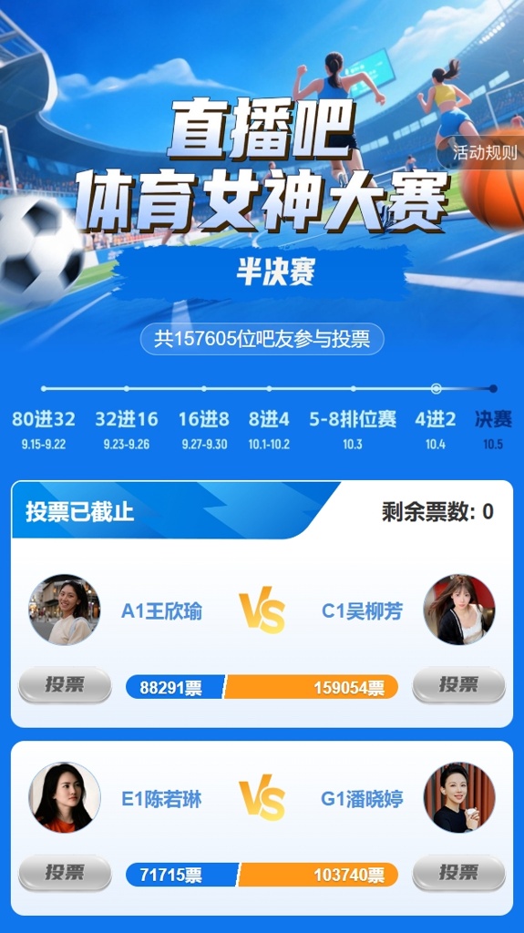 直播吧体育女神大赛半决赛赛果:吴柳芳、潘晓婷会师总决赛!